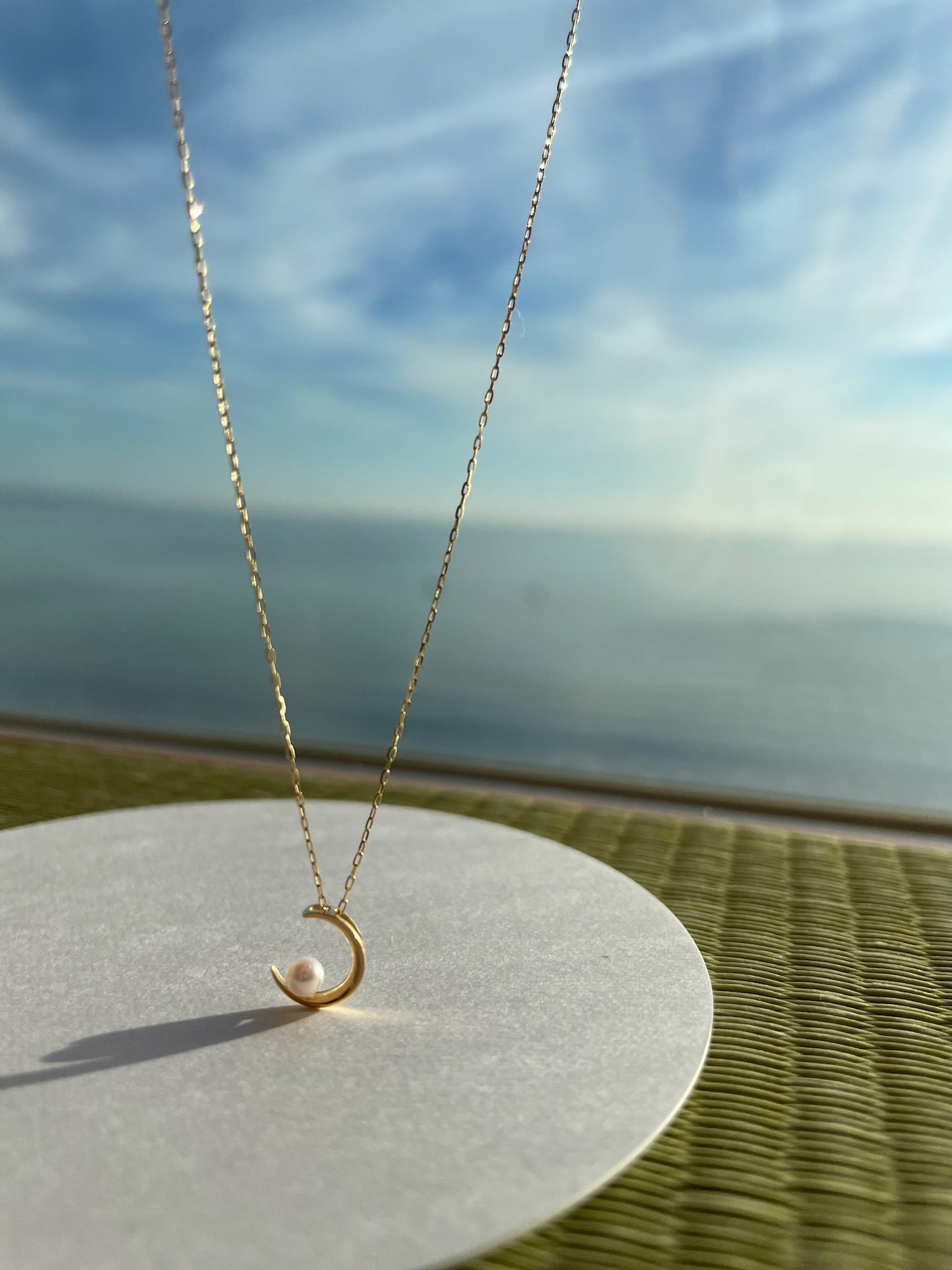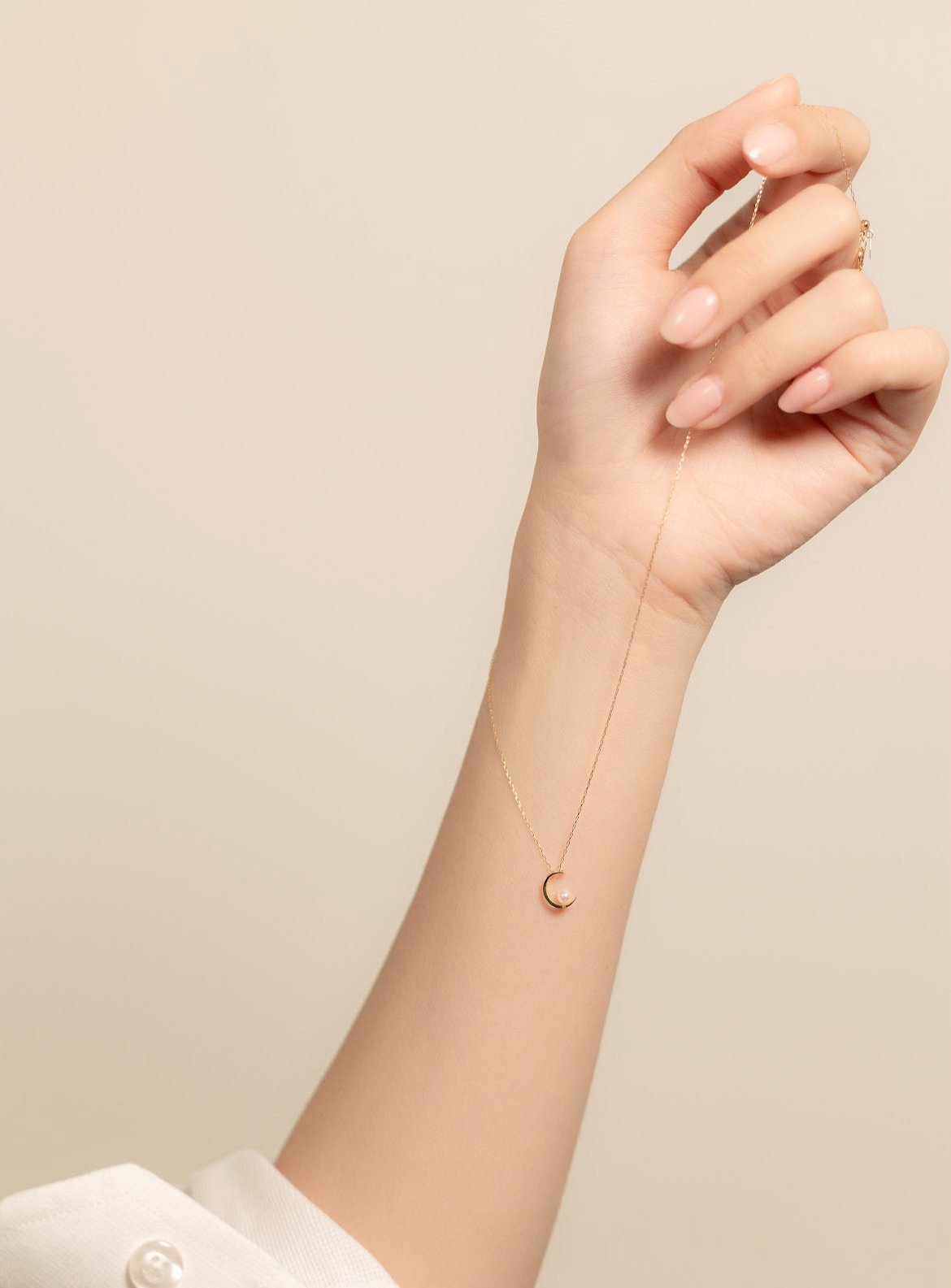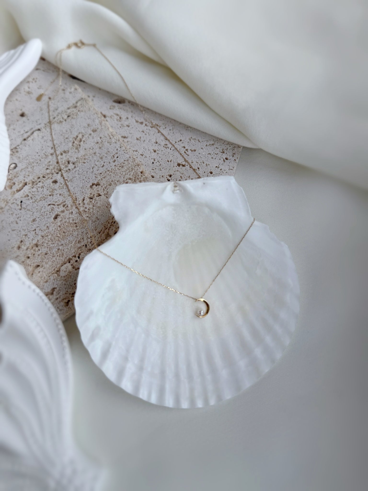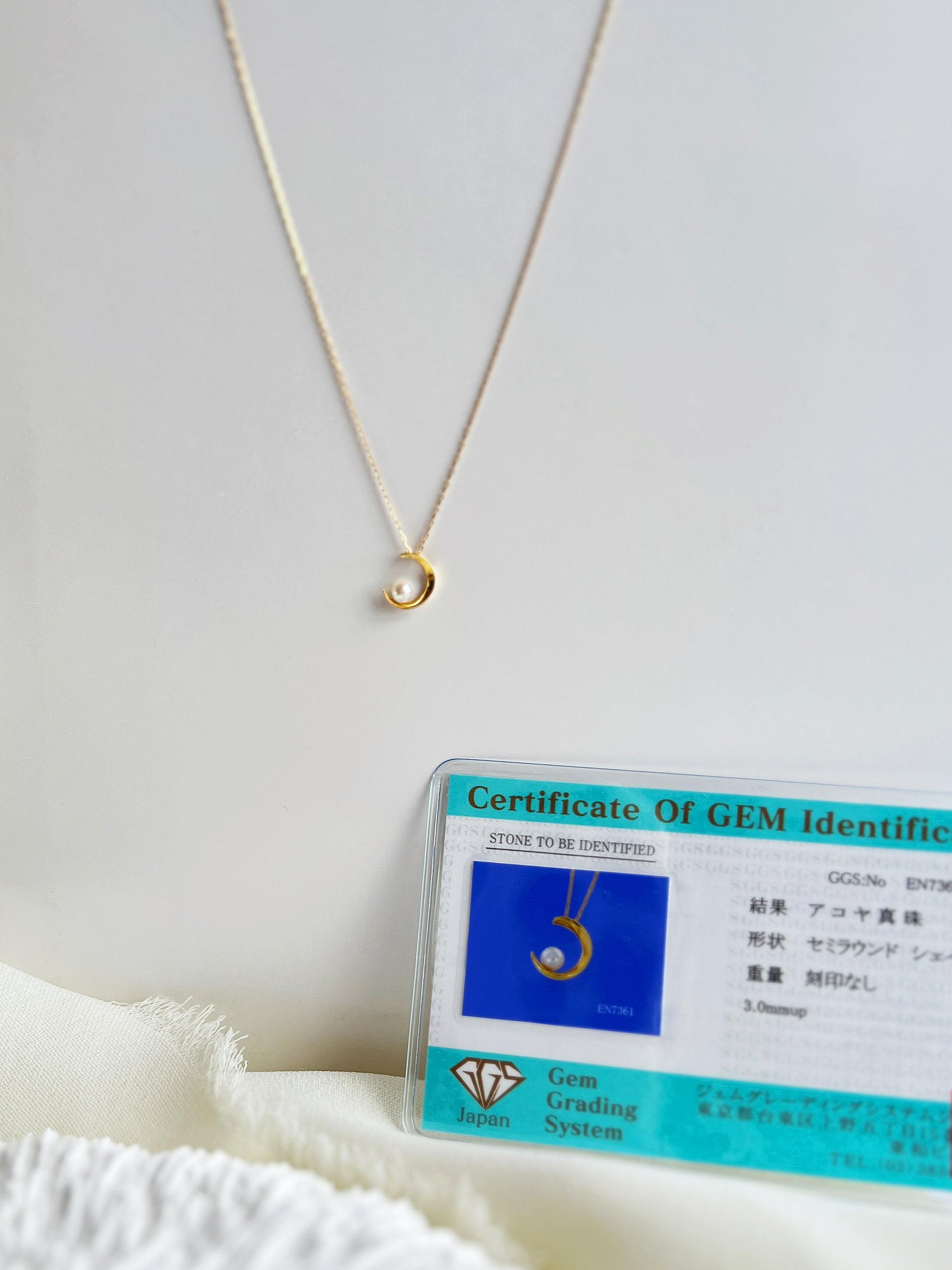 18K Solid Gold with 3mm Japan Akoya Pearl Necklace -Luna Moon Necklace