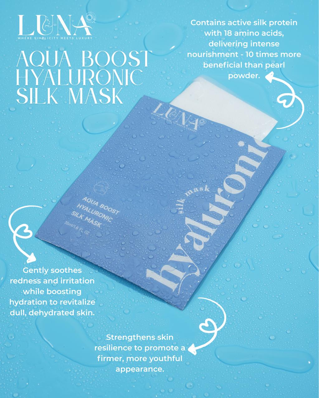 Luna Aqua Boost透明質酸蠶絲面膜專為深層持久保濕而設計,瞬間煥活暗沉、缺水的肌膚