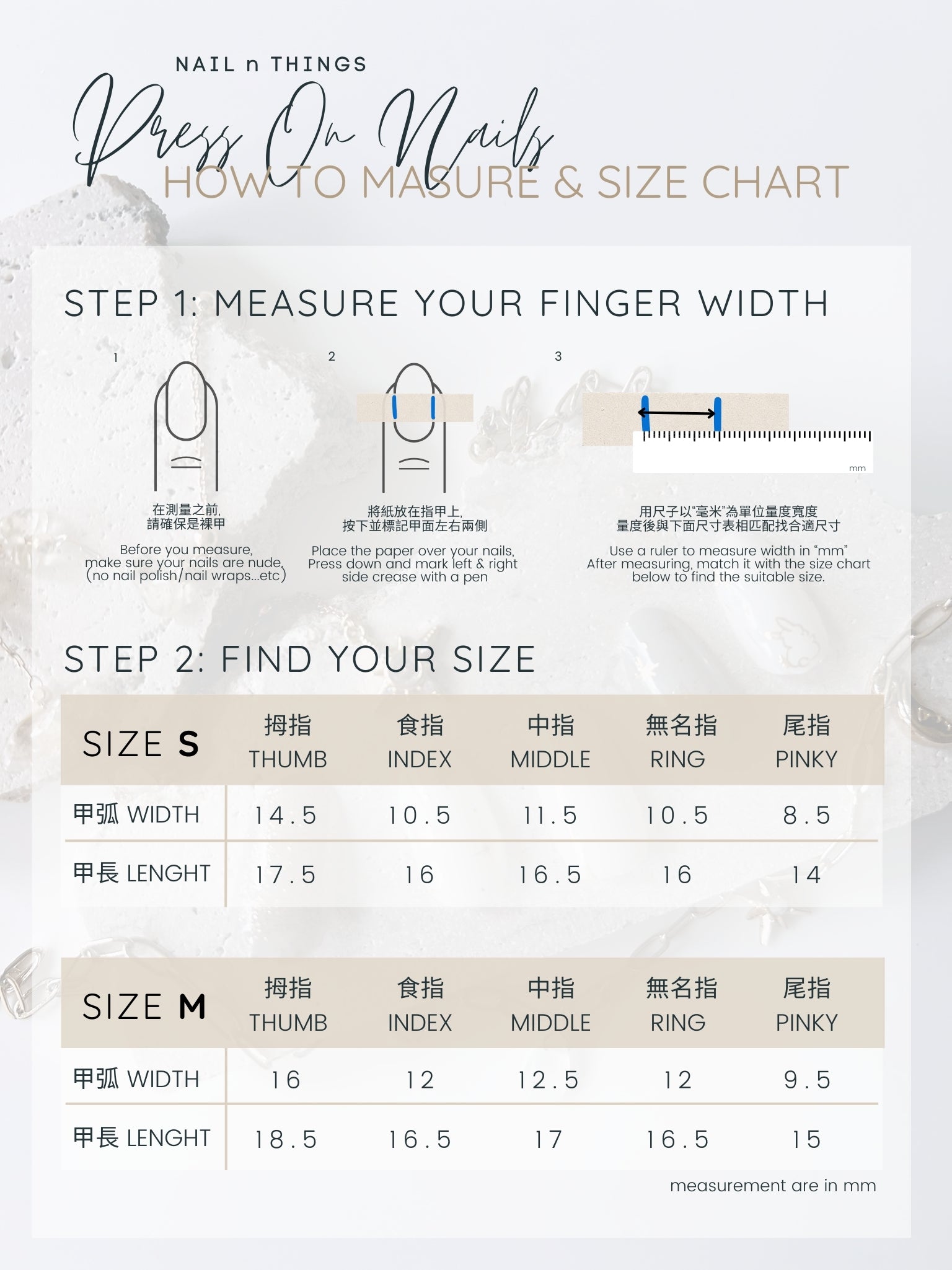 -All Press on Nails are made by hand, there may be a 0.5-1mm difference in size.